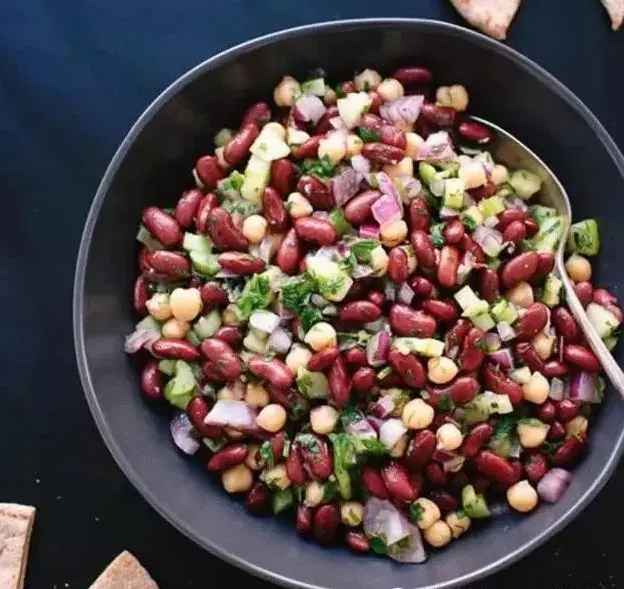 1. Put the prepared kidney beans, chickpeas, onions, celery, tomatoes, cucumbers, parsley and dill (or mint) in a bowl.
