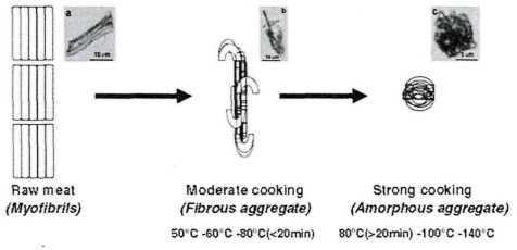 The structures of different proteins changed sequentially at different temperatures. First, from 40 to 52.5°C, sarcoplasmic proteins and myofibrillar proteins were denatured, resulting in a slow loss of fluid from the muscle fibers to the extra-muscular space; second, between 52.5 and 60°C, the water loss of the muscle fibers is getting faster and faster, reaching a maximum speed and extent at about 59°C, but the length of the muscle is still not completely shortened, which may be mainly due to the thermal contraction of collagen in the muscle at about 58°C. At 64 to 94°C, lateral and longitudinal contractions of muscle fibers become obvious, and this process is accompanied by increased thermal processing losses, and thermal contraction of intramuscular, perimuscular, and extra muscular collagen reaches the greatest extent. Finally, long-time cooking results in partial or complete gelatinization of extra muscular collagen, followed by perimuscular and intramuscular collagen. The process of gelatinization involves the structural decomposition of the collagen protein helix into random helices structure, thereby forming a gel that is different from the natural collagen and can be soluble in warm water.