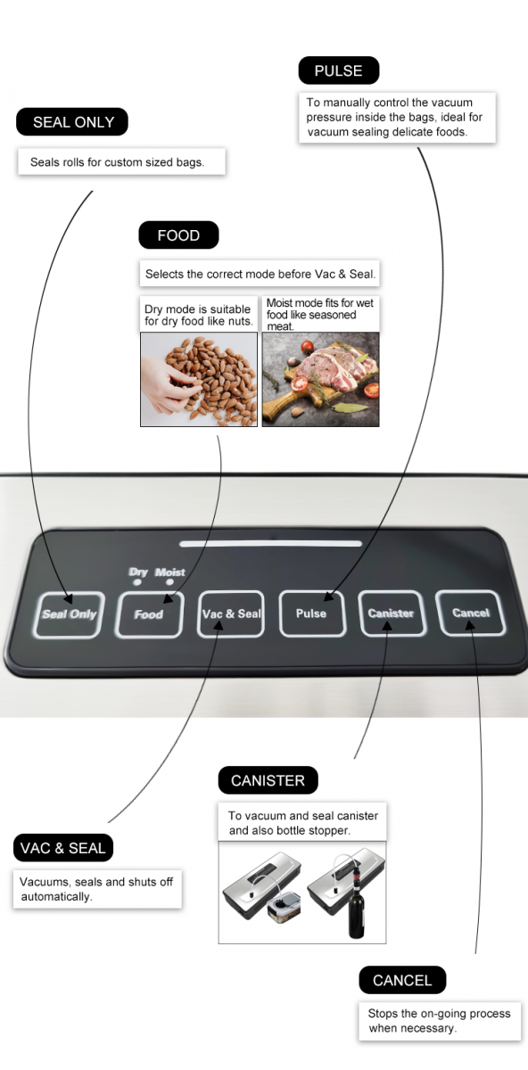 -Separate vacuum mode for dry and moist food.